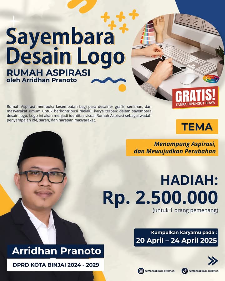 Binjai, WartaPolri.Com – Hal ini dikatakan Anggota Dewan Perwakilan Rakyat Daerah ( DPRD ) Fraksi Nasdem Kota Binjai ARRIDHAN PRANOTO pada WartaPolri.Com melalui WhatsApp ketika ditanya tentang SAYEMBARA DESAIN LOGO RUMAH ASPIRASI berhadiah 2,5 juta rupiah untuk 1 orang yang digelarnya dari tanggal 20 Apri – 24 April 2025.
