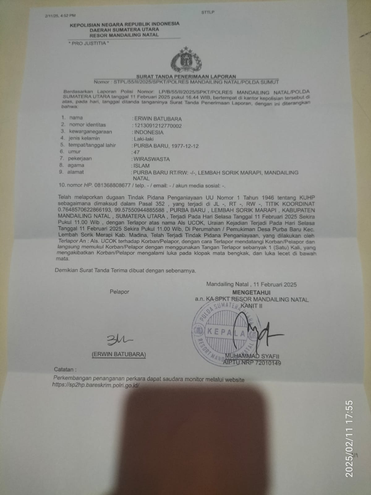 Madina, WartaPolri.Com – Sudah 3 bulan laporan / pengaduan korban penganiayaan terhadap Erwin Batubara di Polres Mandailing Natal seperti berjalan ditempat, pengaduan ini sesuai dengan LP B/55/2025 pukul 16/43 wib SKPT Polres Mandailing Natal, yaitu